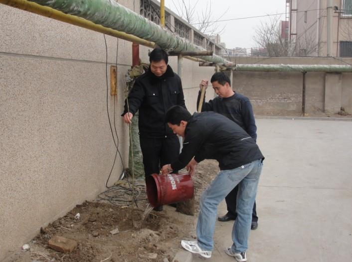 汽車三隊(duì)6個線路團(tuán)隊(duì)、后勤團(tuán)隊(duì)和保修廠團(tuán)隊(duì)共同捐資購買了山楂樹、柿子樹、板栗樹和櫻桃樹共計(jì)28株,由團(tuán)隊(duì)成員分別栽植在西站辦公樓后車場的東墻、北墻和西墻處。